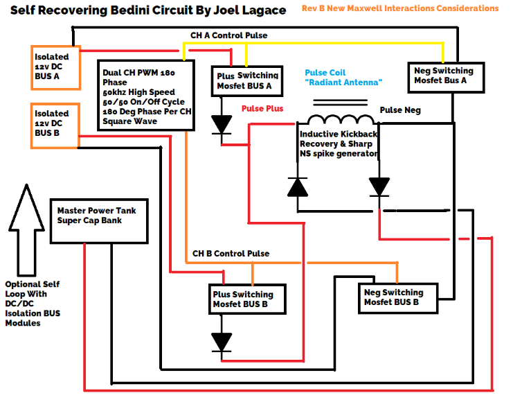 Traditional Bedini drivers harvest the inductor’s collapse into a separate battery. Attempts to self-loop through transformers or inverters usually lose the advantage in conversion losses. Rev B reduces those losses by keeping the coil magnetically “alive” between pulses while recovering residual kickback directly into the pulse rails.